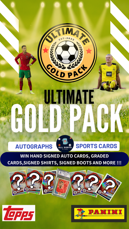 The ultimate footballing experience. Uncover the worlds best super stars in All Sorts Of Cards Ultimate Packs. Packs contain a 1 in 4 chance of scoring an autographed card, numbered parallel, patch card or even a graded PSA or other grading company slabbed card, as well as sealed packs. What will you find? Get a golden ticket in your pack and you'll win some crazy hand signed merchandise, this could be signed shirts, hand signed cards and even football boots. Good luck.